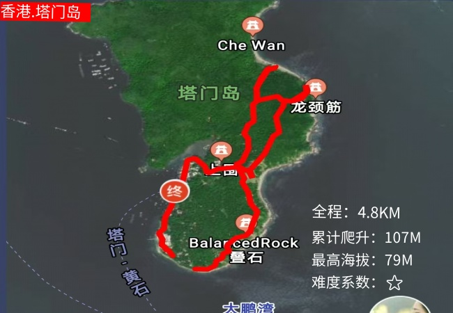 塔門島穿越,全程4.8公里,累計爬升107米,最高海拔79米,休閑難度。
